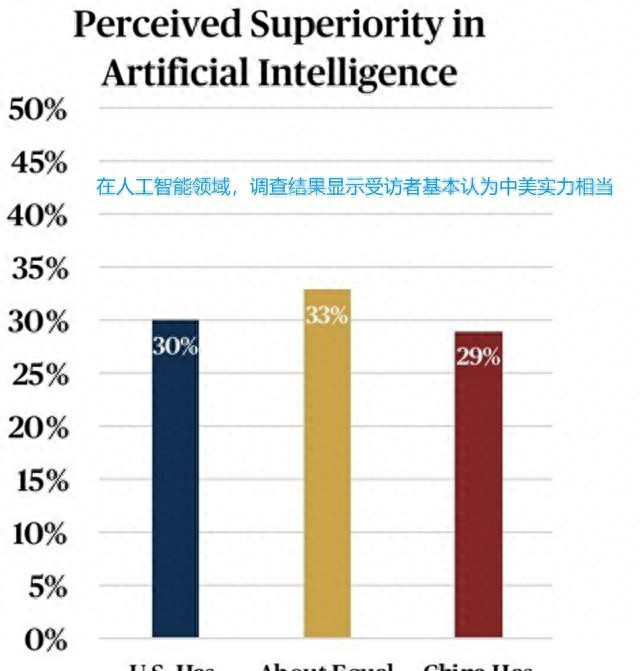 技术层面同样打了折扣。在人工智能领域,认为美国领先的仅 30%,把票投给中国的也有 29%;网络安全美国领先 27%,中国领先 32%。这几乎是五五开,与几年前“硅谷科技统治世界”的口号判若两人。显示器那端的数字,让华盛顿的“科技脱钩”论更加紧迫,也更显焦虑。