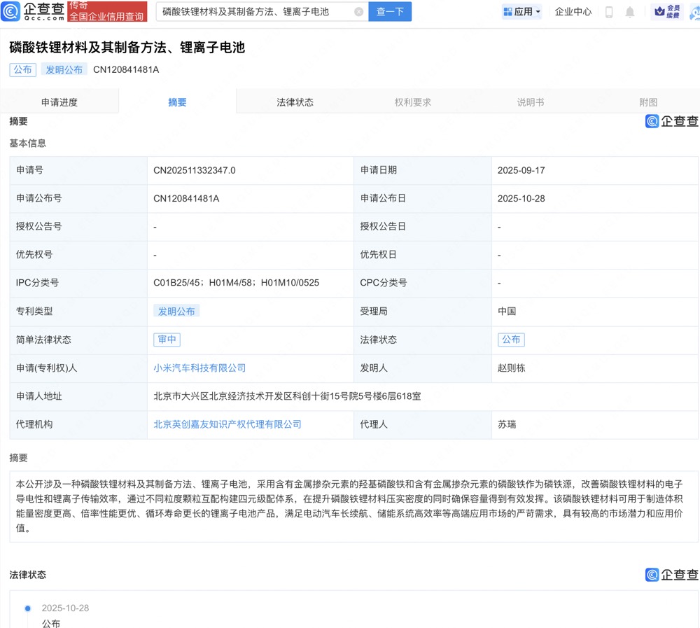 近日,小米汽车科技有限公司申请的“磷酸铁锂材料及其制备方法、锂离子电池”专利公布。企查查专利摘要显示,本公开采用含有金属掺杂元素的羟基磷酸铁和含有金属掺杂元素的磷酸铁作为磷铁源,改善磷酸铁锂材料的电子导电性和锂离子传输效率,通过不同粒度颗粒互配构建四元级配体系,在提升磷酸铁锂材料压实密度的同时确保容量得到有效发挥。该磷酸铁锂材料可用于制造体积能量密度更高、倍率性能更优、循环寿命更长的锂离子电池产品在线配资交易·加杠网,满足电动汽车长续航、储能系统高效率等高端应用市场的严苛需求,具有较高的市场潜力和应用价值。